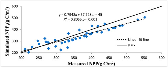 The measured aboveground NPP data included 45 sites (five plots per site) of different vegetation types. The details of the sampling time and methods can be found in [19,60]. NPP simulated by the CASA model was compared with the measured NPP (Figure 2). The result indicated that the simulated NPP showed a good correlation with the measured NPP (R2 = 0.8, p < 0.001).
