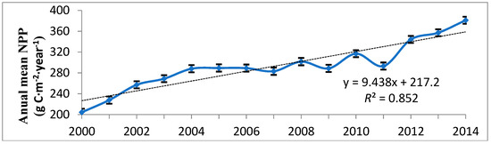 The annual average NPP in the Jinghe River basin from 2000 to 2014 was calculated and is shown in Figure 3. Generally, the NPP in the study area showed an increasing trend, with an increase rate of 9.438 g C·m−2·year−1. The highest value of annual average NPP in the 15 years was in 2014, while the lowest was in 2000. The change process can be divided into two parts: from 2000 to 2006, the NPP increased relatively moderately, then increased rapidly with fluctuations from 2007 to 2014.