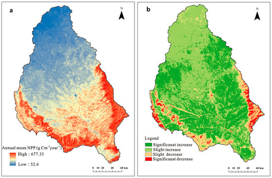 Spatial pattern of the mean NPP (a) and the change trend in the NPP (b) in the Jinghe River basin from 2000 to 2014.
