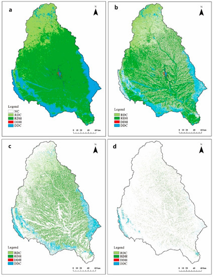 Spatial pattern of different conditions of the NPP change of the entire basin (a); areas with a slope less than 15° (b); areas with a slope between 15 and 25° (c); and areas with a slope greater than 25° (d) in the Jinghe River basin from 2000 to 2014. NC is the vegetation with no change, RDC is the restoration of vegetation dominated by meteorological conditions, RDH is the restoration of vegetation dominated by human activities, DDC is the degradation of vegetation dominated by meteorological conditions, DDH is the degradation of vegetation dominated by human activities.