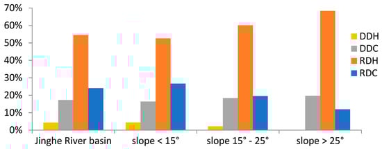 Area statistics of the driving factors in NPP change in the Jinghe River basin and different slopes. RDC is the restoration of vegetation dominated by meteorological conditions, RDH is the restoration of vegetation dominated by human activities, DDC is the degradation of vegetation dominated by meteorological conditions, DDH is the degradation of vegetation dominated by human activities.