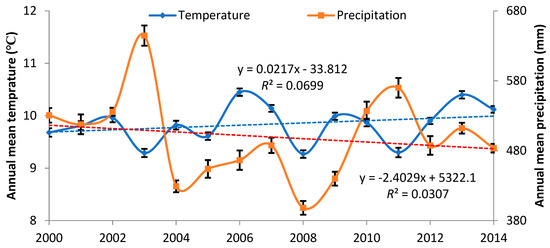 Interannual variations in the annual mean temperature and annual precipitation in the Jinghe River basin from 2000 to 2014.