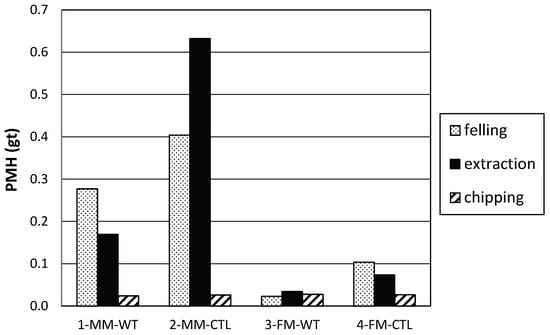 Table 2 shows the amount of harvested biomass for each alternative. The volume harvested was much lower when CTL harvesting was applied, compared with WT harvesting. Average productivity was also lower with CTL, for the same mechanization level (0.0237–0.0165 PMH gt−1 in 2-MM-CTL and 4-FM-CTL compared to 0.0196–0.0092 PMH gt−1 in 1-MM-WT and 3-FM-WT). Figure 1 shows the specific productivity by treatment and work phase. As reported by [23], felling and extraction productivity were significantly different between treatments, whereas chipping productivity was not. Mechanization allowed a dramatic increase of labor productivity. With mechanization, felling-processing productivity increased eight times and felling-bunching productivity 20 times. Extraction productivity increased from 6–8 times, as a result of mechanization. Shifting from CTL to WT harvesting resulted in productivity increases between 40% and 270%, depending on the work step and mechanization level.