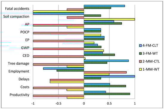 The MCA of the four harvesting alternatives (Figure 2 and Figure 3) was based on per hectare results for the 12 indicators (Table 1).
