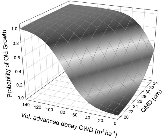 The combined influence of advanced-decay CWD volume and QMD, as predictors of old-growth status, can be readily seen in Figure 2, which demonstrates that as the values of both metrics simultaneously increase, so does the probability that a given stand can be classified as old-growth. Despite the significance of QMD in our final model for distinguishing old-growth from partially harvested stands, diameter distributions did not differ significantly between these two types (Kolmogorov-Smirnov tested at α = 0.05; Figure 3).