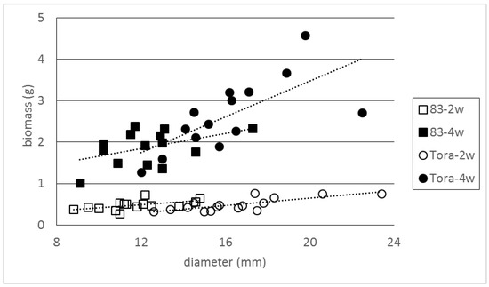 Relationship between cutting diameter and biomass production in fertilizer treatment after two or four weeks in 2009.