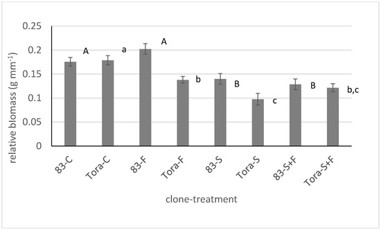 The average relative biomass production, at four-week harvest, by cuttings originating from different clones and treatments (C—control; F—fertilizer, S—soil; S+F—soil and fertilizer) in 2009. The bars represent SE (n = 14–15). The particular clone values with distinct letters (capitals for clone 83 and lowercase for clone Tora) differ from each other significantly (REGW test).