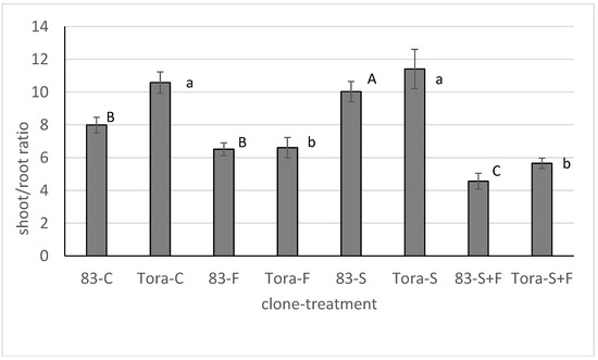 The average ratio between cuttings’ shoot and root biomass productions of various clones and treatments at the end of the experiment in 2009 (C—control; F—fertilizer, S—soil; S+F—soil and fertilizer). The bars represent SE (n = 14–15). The particular clone values with distinct letters (capitals for clone 83 and lowercase for clone Tora) differ from each other significantly (REGW test).