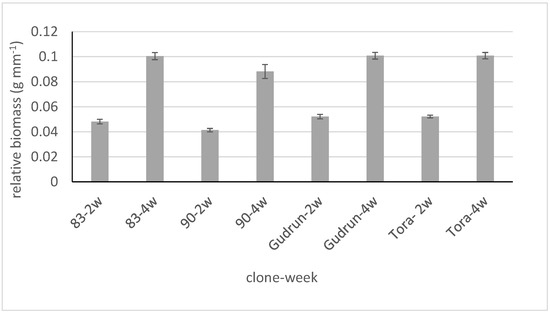 The average relative biomass production by cuttings originating from different clones during two or four weeks in 2010. The bars represent SE (n = 30). The values of particular harvest time with distinct letters differ from each other significantly (REGW test).