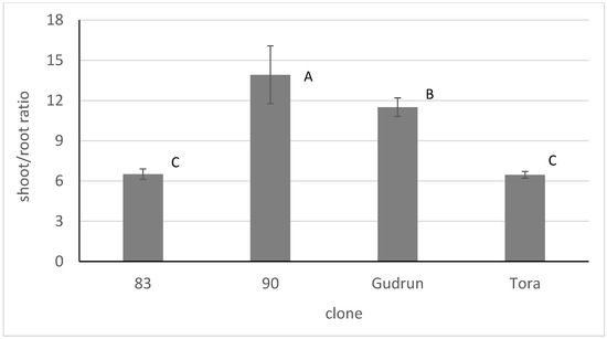 The lower relative biomass growth of clone 90 was accompanied by the smaller biomass of sprouted roots: The shoot/root biomass ratio of this clone was significantly larger than that of other clones (Figure 5). Clone Gudrun also had a larger shoot/root production compared with clones 83 and Tora.