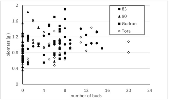 Analysis of the 2010 data also shows that the number of visible buds on cuttings was an unreliable parameter for predicting absolute biomass production when harvested after the first four weeks. No significant relationship was found between the number of visible buds and cutting biomass production by clones (R2 < 0.15 in all cases) either (Figure 6). However, the General Linear Model revealed that both the cutting diameter and clone were significant factors for predicting the number of buds on the cutting (p < 0.0001 and p < 0.05, respectively), but the model reliability was rather low (R2 = 0.29). Inclusion of data about the origin of the cutting from the donor rod did not improve the model neither was this factor significant. The detailed analysis demonstrated that the pattern between cutting diameter and number of visible buds varied by clones (Figure 7). For clone 83 there was a tendency to positive correlation (R2 = 0.10) between cutting diameter and the number of buds. At the same time clone Tora tended to have a similar number of buds regardless of the cutting diameter. In many cases no visible buds were detected on cuttings and it was especially difficult to detect buds in clone 90, where 28 cuttings out of 60 were marked with 0 visible buds. The number of cuttings from clone Tora with no visible buds was tenfold smaller than that of clone 90 in our experiment. Hence, the average numbers per cutting were 7.7; 6.0; 5.0 and 1.8 for Tora, 83, Gudrun and 90, respectively.