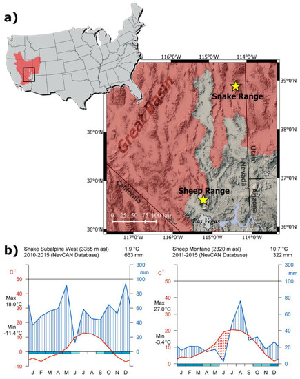 The Snake Range, which falls within the hydrographic Great Basin, is characterized by cool-season precipitation and associated winter snowpack dynamics. Average annual temperature during the first five years of NevCAN operation (2010–2015) was 1.9 °C, and average total annual precipitation was 663 mm (Figure 1b). The Sheep Range is located near the hydrographic boundary between the Great Basin and the Mojave Desert, one of the driest regions influenced by the North American Monsoon [32]. Based on NevCAN data for 2011–2015, the mean annual temperature was 10.7 °C, and the mean total annual precipitation was 322 mm, mostly concentrated in July and August (Figure 1b).