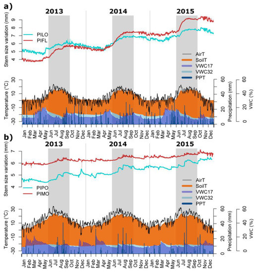 A relatively limited number of variables (i.e., precipitation, air temperature, vapor pressure deficit, and soil temperature) affected stem circadian phenology at both sites. The recurrent presence of precipitation and air temperature as predictors for the presence/absence of stem swelling and irreversible increment suggests that patterns of radial growth reflect site-specific dynamics of evapotranspiration and interactions between moisture conditions and heat. All four pine species experienced prolonged periods of intense water deficit, characterized by no irreversible expansion. During such periods, the recharge of stem water reserves is incomplete, implying that water potential in the cambium remains negative and no radial growth takes place [44]. The range of tree water deficit was similar between sites, but subalpine species in the first part of the growing season presented daily variation of stem size larger than the montane ones. Nevertheless, PILO and PIFL produced regular radial increment, reducing stem water deficit at least for a few hours. PIPO and PIMO showed limited water deficit in June, but then entered a long phase of severe water deficit interrupted only by summer rainstorms.
