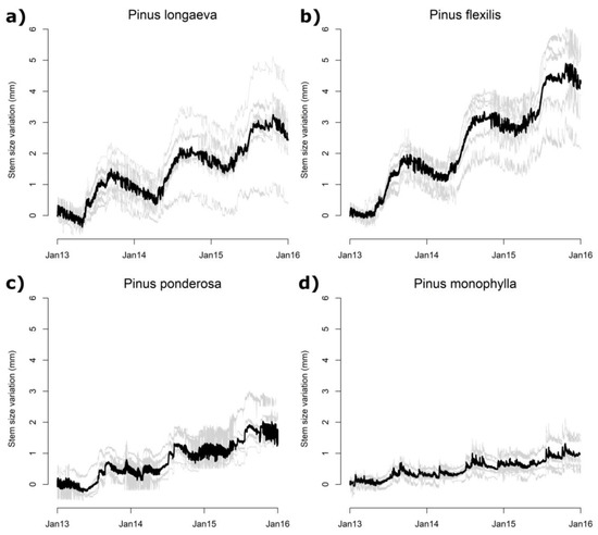 Half-hourly individual dendrometer tracks of stem size variation (gray lines) for PILO (a), PIFL (b), PIPO (c), and PIMO (d) from 1 January 2013 to 31 December 2015. Black bold lines represent the site average. Species codes are the same as in the Figure 2 caption.
