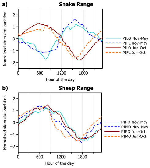 Circadian cycles showed seasonal variability and substantial differences between the northern and southern pine species. At the Snake Range circadian cycles occurring during the cold season (November–May) were opposite in phase than those occurring during the warm season and the early fall (June–October) (Figure 4a). During the winter, for both PILO and PIFL, minimum stem radius occurred in the morning (7:00–7:30), while maxima were in the afternoon (15:30–16:00). During the summer and the early autumn, stem radius reached the maximum in the first hours of the morning in PILO (5:30) and a couple of hours later in PIFL (8:00). Then daily shrinkage began, culminating in the afternoon, first in PIFL (15:30) and then in PILO (17:00). At the Sheep Range no differences emerged between cold- and warm-season stem cycles in PIPO and PIMO (Figure 4b). Maximum stem radius occurred during the morning, first in PIMO (6:30–7:30) and then in PIPO (8:00–8:30). Minimum radial dimension was observed in the afternoon (16:30–17:00) during the warmest months, and about two hours later (18:00–18:30) during the cold season.