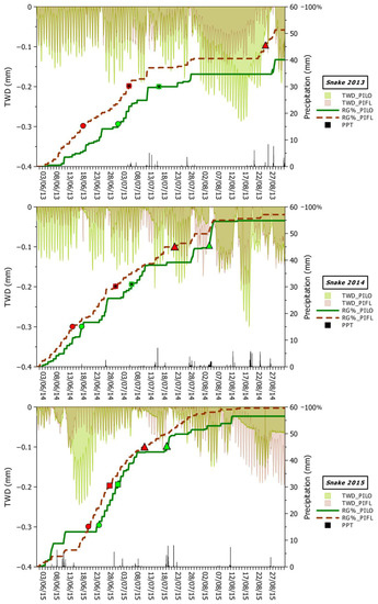 Tree water deficit (TWD) and real growth (RG) time series in 2013–2015 for PILO and PIFL (Snake Range). Symbols represent quartiles of real growth observed between June and September (circles = 25%; squares = 50%; triangles = 75%). Vertical bars represent total hourly precipitation. (Right y axes also represent 100% of RG). For a definition of TWD and RG see main text. Species codes are the same as in the Figure 2 caption.
