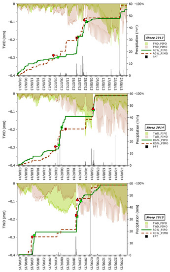 Tree water deficit (TWD) and real growth (RG) time series in 2013–2015 for PIPO and PIMO (Sheep Range). Symbols represent quartiles of real growth observed between June and September (circles = 25%; squares = 50%; triangles = 75%). Vertical bars represent total hourly precipitation. (Right y axes also represent 100% of RG). For a definition of TWD and RG see main text. Species codes are the same as in the Figure 2 caption.