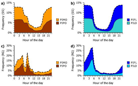 Time series of tree water deficit (TWD) showed different seasonal patterns of stem shrinkage/swelling between the Snake (Figure 5) and the Sheep Range (Figure 6). In general, all species experienced periods of water stress, particularly in the second part of the growing season (i.e., August). PILO and PIFL experienced lower values of TWD compared to PIPO and PIMO during June and part of July. At the Snake Range TWD values reached zero almost every day, at least for a few hours, resulting in a slow but constant real growth. A similar pattern was observed at the Sheep Range in June 2013 and 2014, but not later in the growing season, when TWD dropped for both PIPO and PIMO to approximately −0.25 mm, and RG occurred as episodic pulses driven by the onset of monsoonal precipitation (Figure 6). In 2015, after a severely dry winter, real growth for both species at the monsoonal site was concentrated in just three pulses during three major rainstorms: first in mid-June, second in mid-July, and third in early August. At the Snake Range, the species characterized by smaller individuals (PIFL) completed 25%, 50%, and 75% of total June–September radial increment usually 1–2 weeks before the species with larger average stems (PILO). At the Sheep Range radial growth was simultaneous between the two species, with no size effect. Stem swelling between June 1st and September 30th occurred prevalently during the night, between 18:00 and 06:00, especially at the Snake Range, whereas at the Sheep Range stem swelling was observed until 08:00 (Figure 7a,b). Real growth took place only in the morning hours, between 02:00 and 08:00 at the Sheep Range (with a drop between 06:00 and 07:00; Figure 7c) and between 04:00 and 05:00 at the Snake Range (Figure 7d).