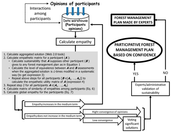 This paper formulates a new strategy for participatory forest management consisting of encouraging public participation as long as it increases empathy among participants. The strategy requires the homogeneous representation of the opinion of a participant (i.e., to determine how they assess a forest plan and identify the best one). Utility assessments are prepared for participants through pair-comparisons between meaningful points in the territory and from value functions based on forest indicators. The best plan is designed by applying combinatorial optimization algorithms to the utility of a participant. The calculating of empathy—of one participant relative to another—is based on the equivalence of their respective utilities when the current forest plan is modified. This involves calculating the opinions that are due to systematic changes in the collective plan for those participants that each participant supposes will affect the utility of the other participants. Calculating empathy also requires knowing the interactions among participants, which have been incorporated through agent-based simulation models. Application of the above methodology has confirmed the association between increases in empathy and convergence of opinions in different scenarios: well and medium-informed participants and with and without interaction among them, which verifies the proposed strategy. In addition, this strategy is easily integrated into available information systems and its outcomes show advantages over current participatory applications.