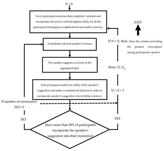 Every participant examines their neighbors’ solution and incorporates the opinion with the highest utility for all the participants belonging to their neighborhood into their memory. We shall denote this plan as un(A).