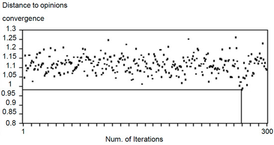 In the simulation carried out, the maximum convergence of opinions corresponds to the iteration number 268 (see Figure 9). In this iteration, the aggregate evaluation corresponds to ug-268 = (0.81, 0.56, 0.53, 0.52, 0.24, 0.44), which represents an improvement of 12.07% with respect to the “no interaction” scenario (percentage of improvement between OpC268 and OpC1).