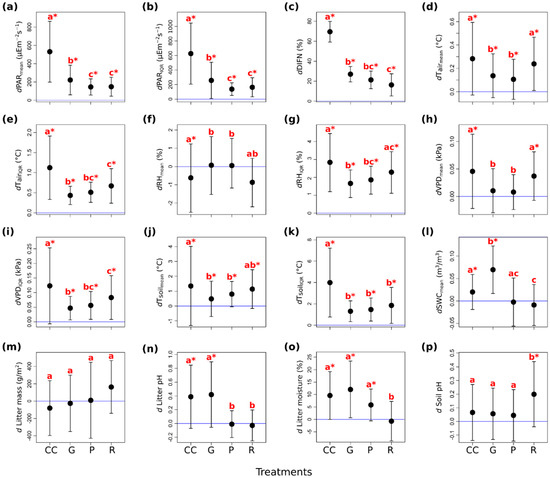 Changes in means and interquartile ranges (IQR) of the relative values of the site condition variables among the forestry treatments in Pilis Mountains, Hungary, 2015. (a) Mean and (b) IQR of photosynthetically active radiation (PAR; μE m−2 s−1); (c) mean of relative diffuse light (DIFN; %); (d) mean and (e) IQR of air temperature (Tair; °C); (f) mean and (g) IQR of relative humidity (RH; %); (h) mean and (i) IQR of vapor pressure deficit (VPD; kPa); (j) mean and (k) IQR of soil temperature (Tsoil; °C); (l) mean of soil moisture (SWC; m3/m3); (m) total mass of collected litter on the surface (g/m2); (n) litter pH (pH in water); (o) gravimetric moisture content of litter samples (%); (p) soil pH (pH in water). The letter ‘d’ in the variable abbreviations refers to the differences from the mean values measured in the control plots. The treatment types are coded as follows: CC—clear-cutting; G—gap-cutting; P—preparation cutting; R—retention tree group. Full circles show the mean and vertical lines denote the standard deviation of the samples. Letters designate the significant differences among the treatments (all of the pairwise multiple comparisons based on the linear mixed effects models; Tukey-test, alpha = 0.05), while asterisks denote significant differences from the values measured at the control plots (linear mixed effects models without intercept, p < 0.05). The horizontal blue line shows the level of the control.
