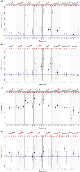 Temporal variability of the selected microclimate variables among the experimental treatments and months in the Pilis Mountains, Hungary, 2015. (a) Mean of the photosynthetically active radiation ([PAR] μE m−2 s−1); (b) mean of vapor pressure deficit ([VPD] kPa); (c) mean of soil temperature ([Tsoil] °C); (d) mean of soil moisture ([SWC] m3/m3). The letter d in the variable abbreviations refers to the differences from the mean values measured in the control plots. Treatment types are coded as follows: CC—clear-cutting; G—gap-cutting; P—preparation cutting; R—retention tree group. Full circles show the mean and vertical lines denote the standard deviation of the samples. Letters designate the significant differences among the treatments and months (all of the pairwise multiple comparisons based on the linear mixed effects models: Tukey test, alpha = 0.05). The horizontal blue line shows the level of the control.
