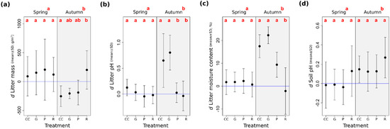 Seasonal changes in selected soil and litter variables in Pilis Mountains, Hungary, 2015. (a) Total mass of collected litter on the surface (g/m2); (b) litter pH (pH in water); (c) gravimetric moisture content of litter samples (%); (d) soil pH (pH in water). The letter d in the variable abbreviations refers to the differences from the mean values measured in the ‘Control’ plots. Treatment types are coded as follows: CC—clear-cutting; G—gap-cutting; P—preparation cutting; R—retention tree group. Full circles show the mean and vertical lines denote the standard deviation of the samples. Letters designate the significant differences among the treatments (all of the pairwise multiple comparisons based on the linear mixed effects models; Tukey test, alpha = 0.05). The horizontal blue line shows the level of the control.