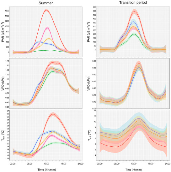 Diurnal patterns of selected microclimate variables. Diurnal magnitudes of PAR (photosynthetically active radiation), VPD (vapor pressure deficit) and Tsoil (soil temperature) among treatments in the peak of the growing season (i.e., June, July, August; left) and during the transition period (March, April, September, October; right), respectively. Lines represent means calculated by LOWESS function (based on the 6 replicates for each variable per month), bands represent 95% confidence intervals. Colors are coding the treatments: control—green; clear-cutting—red; gap-cutting—purple; preparation cutting—orange and retention tree group—blue. Note that scales of y-axes vary between graphs.