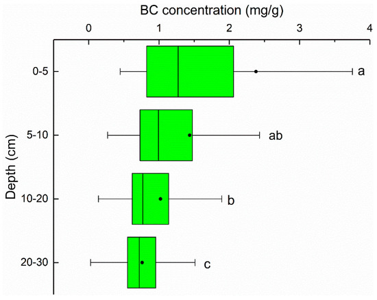 The BC concentration in different layers of forest soils of the Great Khingan Mountains ranged from 0.03 to 36.91 mg C g−1, with a mean of 1.44 ± 0.11 mg C g−1. The maximum was observed in the 0–5 cm layer and the minimum in the 20–30 cm layer. Soil BC concentration decreased with depth (Figure 3). In the 0–5 cm layer, the mean value of soil BC concentration was 2.38 ± 0.37 mg C g−1, the highest of the studied soil depth, followed by 1.44 ± 0.14 mg C g−1 at 5–10 cm, 1.02 ± 0.08 mg C g−1 at 10–20 cm layer, and 0.76 ± 0.03 mg C g−1 at 20–30 cm soil depth. Significant differences in BC concentration were observed between layers; soil BC concentration at 0–5 cm soil depth was significantly higher than that at 10–20 cm (p < 0.05). The soil BC concentration at 20–30 soil depth was significantly lower than that at 10–20 cm (p < 0.05).