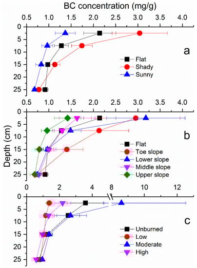 Besides aspects and fire severities, slope position may also affect soil BC contents, for example, a greater accumulation of organic material on lower slope positions [22,31]. Our results suggest that soil BC content on lower slopes is higher than on middle and upper slopes. Our results are inconsistent with previous findings [22,24]. This might be attributed to runoff and soil erosion [57] on post-fire terrain, which carry soil BC to lower places. The runoff and soil erosion are common following heavy rainfall events after burning of steep terrain [57], resulting in the accumulation of BC on lower slopes. However, the runoff and soil erosion processes are highly complicated and understanding of the influence of soil erosion on the movement of soil BC downwards remains quite limited and requires further exploration [57,58].