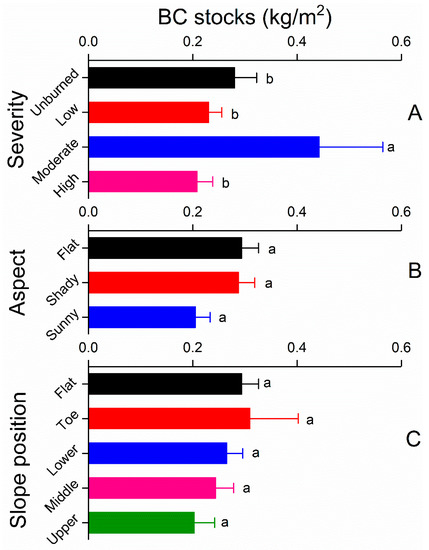 Soil BC stocks of various fire severities (A), on different aspects (B) and on different slope positions (C) in the Great Khingan Mountains. Error bars indicate standard errors.