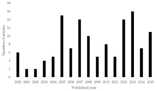 Distribution of articles related to forest products secondary transportation over the years of publication (2000 to 2015).