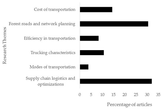 Theme I (cost) primarily dealt with articles focusing on financial aspects of trucking operations. The theme also included articles related to detailed time studies; strategies to minimize the overall transportation costs; assessing the impacts of transportation distance on the final cost of delivered forest products; and evaluating the performance of transportation cost estimating software and models. Theme II (roads and route planning), focused on every aspect of forest roads, including engineering, planning, design, construction, maintenance, spatial modeling, and computer software. Theme III (trucking characteristics) was specific to road transportation: truck size and configuration, speed at various road conditions, weight limits, payload enhancement measures, trucking performance, and features of trailers. Theme IV (efficiency and safety) dealt with fuel efficiency, log truck accident analysis, social surveys with related stakeholders, evaluation of fuel consumption capacity, and potential effects of forest road erosion on the supply chain. Theme V (other modes of transportation) focused on articles dealing with railways and water transportation. Theme VI (supply chain and optimizations) included modelling supply chain in different regions, geospatial evaluations, linear programming, strategic and tactical planning, optimization of supply chain, decision support tools for wood procurement and management, and simulation of logistics models.