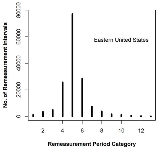 Figure 1. The interval length distribution of one-year categories in FIADB for 34 States in the United States, with the end-of-interval measurement made between 1998 and 2016.