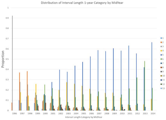 Figure 2. The interval length distribution of one-year categories (of one to 13 years) in FIADB for 34 States in the United States, by MidYear ranging from 1996 to 2014.