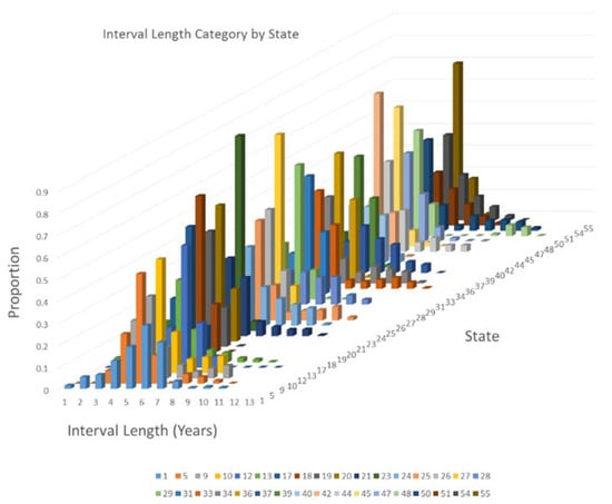 This figure also shows that, as the annual inventory design matured, these distributions coalesced toward the five-year category, although this trend appears to be disrupted in more recent years. Another significant factor contributing to differences in these distributions is that the National annual design for FIA was implemented in each State in a cost effective manner with respect to completion of the last complete measurement of the previous design. This resulted in different rates of convergence toward the target five-year re-measurement interval. Figure 3 gives the interval length distributions by State Code, with State Codes given in Table 1.