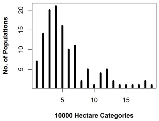 Figure 4. The distribution of population sizes for the 125 populations in the simulation in categories rounded up to the nearest 10,000 Hectares.