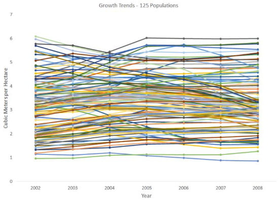 Figure 5. The mean trend in cubic meter growth per hectare per year for each of the 125 populations over the period of 2002 through 2008.