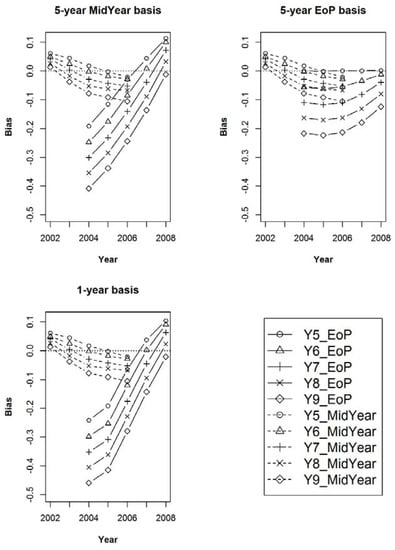 Figure 6. The mean bias for the MidYear annual mean (for years 2002 through 2006) and the EoP annual mean Estimators (for years 2004–2008) after 100 iterations of samples of size 1000 within the 125 populations, for sample observation lengths of five, six, seven, eight, and nine years, respectively. Each graph is relative to a unique estimand: (a) Estimand 1 with a five-year MidYear basis; (b) Estimand 2 with a five-year EoP basis; (c) Estimand 3 with a one-year basis.