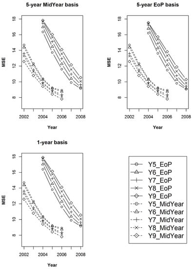 Figure 7. The mean of the Mean Squared Errors (MSE) for the MidYear annual mean (for years 2002 through 2006) and the EoP annual mean Estimators (for years 2004–2008) after 100 iterations of samples of size 1000 within the 125 populations, for sample observation lengths of five, six, seven, eight, and nine years, or deviations (from 50 dy) of 0, 10, 20, 30, and 40, respectively. As in Figure 6, each graph is relative to a unique estimand: (a) Estimand 1 with a five-year MidYear basis; (b) Estimand 2 with a five-year EoP basis; (c) Estimand 3 with a one-year basis.