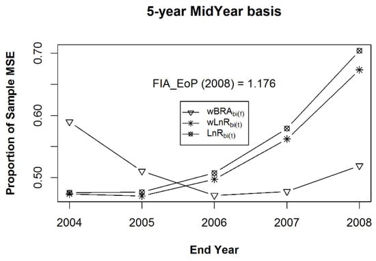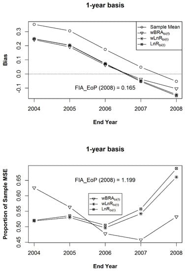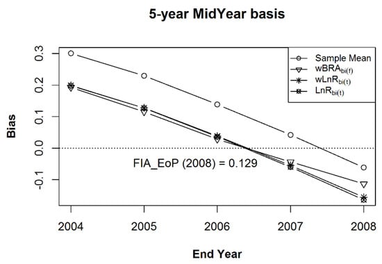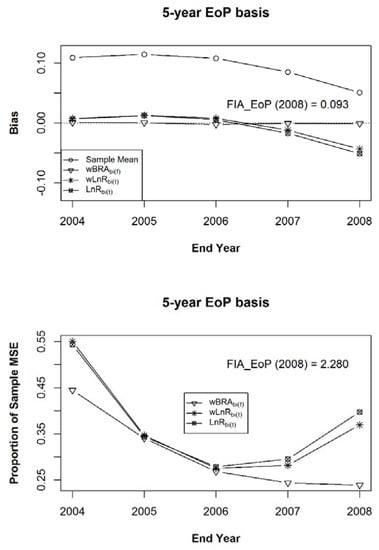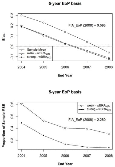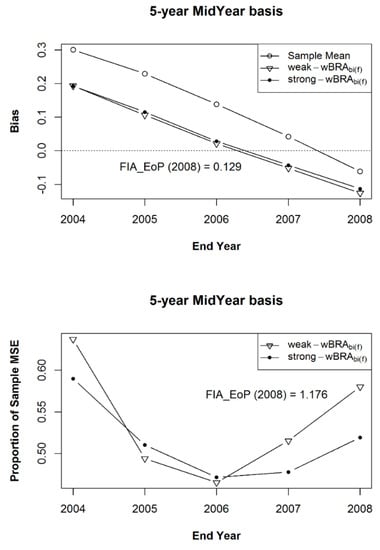 As mentioned above, to compare the various approaches to composite estimator development, I combine the samples of the five interval lengths within each population into a single sample in each iteration. Figure 8, Figure 9 and Figure 10 show, for Estimands 1, 2, and 3, respectively, the simulation mean bias in the top graph and the simulation mean of Mean Squared Errors as a proportion of the MSE of the sample mean in the bottom graph for the bias-adjusted w B R A b i ( f ) EoP estimator in Equation (8), for years 2004–2008, after adjustment by estimates from the weak and strong prior samples. The methods used to calculate the final values for the simulation mean bias and mean MSE were the same as those used in Figure 6 and Figure 7, except that the initial value for each sample in each population was calculated from the combined sample from all five interval lengths. That is, in contrast to Figure 6 and Figure 7, the summary statistics were compiled after 100 iterations of composite samples, of each of the five (size 1000) samples from each observation length of five, six, seven, eight, and nine years, within each of the 125 populations. The estimand in Figure 8 is Estimand 1, the population’s five-year annualized mean centered on each year of interest, corresponding to Expectation (2) above with a five-year MidYear basis, while the estimand in Figure 9 is Estimand 2, the population’s five-year annualized mean ending on each year of interest, corresponding to Expectation (2) with a five-year EoP basis, and the estimand in Figure 10 is Estimand 3, the population’s annual average for each year of interest, corresponding to Expectation (3). Noteworthy in the bottom graph of all three figures is the significant reduction in MSE achieved by the bias-adjusted estimator under both weak and strong prior information. Figure 9, of course, shows the statistics for the estimator that best matches the pseudo-estimator to the estimand. In the lower graph of that figure, the MSE in the presence of stronger prior information is always lower than it is in the presence of the weaker prior information. The same is not true for Figure 8 and Figure 10, in which the estimator is based on estimands that are not as well matched to the pseudo-estimator. In those same three figures, I also list the simulation mean bias and mean of the mean squared errors (for 2008) for the FIA_EoP estimator, given in Roesch et al. [7], which, in this case, is the mean of five consecutive EoP estimators. The year 2008 is the only year for which the FIA_EoP estimator could be calculated, given the kept simulation results. It is important to note that in all three figures FIA_EoP is more biased and has a higher MSE than the sample mean, due to the known lag bias inherent to that estimator. In this comparison, the sample mean could be viewed as being derived from a single panel, while the FIA_EoP estimator is derived from five consecutive panels. In Figure 9, for 2008, the mean MSE for FIA_EoP is shown to be about seven times higher than w B R A b i ( f ) under weak prior information and about 10 times higher under strong prior information.