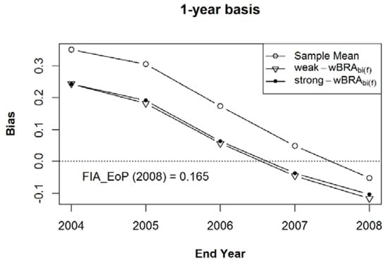 Figure 9. The simulation mean bias (a) and the mean of Mean Squared Errors ((b), expressed as a proportion of the MSE of the sample mean) for Estimand 2 and the bias-adjusted EoP Estimator w B R A b i ( f ) (for years 2004–2008), using the weak and strong prior samples after 100 iterations of samples of size 1000 within the 125 populations of a composite sample of sample observation lengths of five, six, seven, eight, and nine years, in equal proportions.