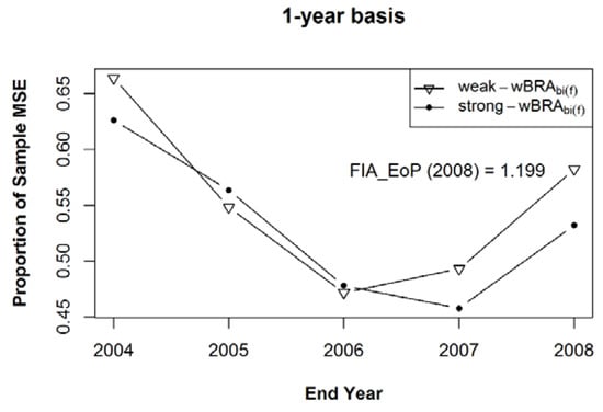 Figure 10. The mean bias (a) and the mean of Mean Squared Errors ((b), expressed as a proportion of the MSE of the sample mean) for the bias-adjusted EoP Estimator w B R A b i ( f ) (for years 2004–2008), relative to Estimand 3, using the weak and strong prior samples, after 100 iterations of samples of size 1000 within the 125 populations of a composite sample of sample observation lengths of five, six, seven, eight, and nine years, in equal proportions.