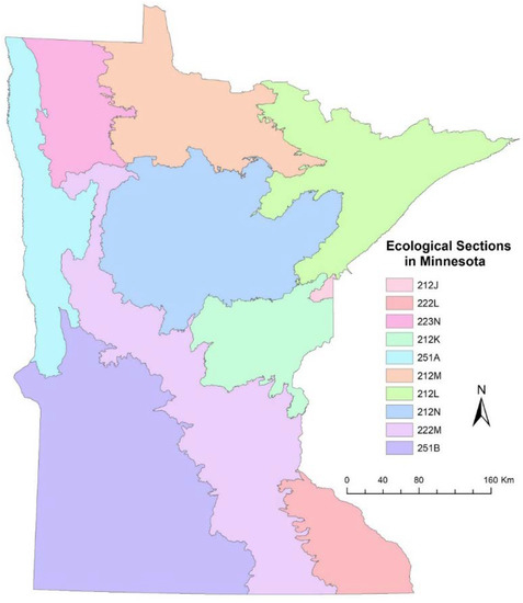 The state of Minnesota is located in the north-central portion of the United States and is bordered by Canada to the north. Approximately 35% of the 22.5 million hectares of Minnesota is classified as forested [27]. The forests of Minnesota are diverse and include three of Bailey’s ecosystem provinces: Prairie Parkland in the west, the Eastern Deciduous Forest through the center and southeastern section, and the Laurentian Mixed Forest in the northeast [28]. The past glacial activity has substantially shaped topography and soil condition across the state, generating a low topographic relief landscape and a broad selection of soil conditions ranging from sandy outwash plains to rich peat bogs [29]. The soil composition has influenced vegetation cover, resulting in pine (Pinus) species commonly observed on sandier less nutrient-rich soils, hardwoods observed on nutrient-rich silt loams, and spruce (Picea), tamarack (Larix), and ash (Fraxinus) species observed in poorly drained bogs. In addition, past human actions have also had a large effect on the current forest cover in Minnesota. Agricultural conversion and intensive logging practices during the late 19th and early 20th centuries have greatly influenced current forest distribution and composition [29].