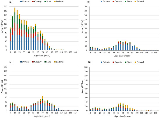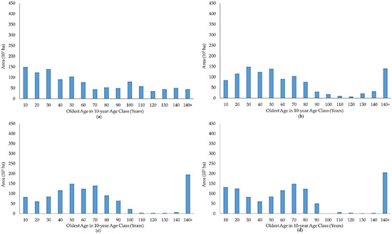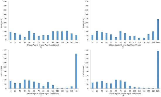 Current age-class distribution of aspen (a), oak (b), northern hardwoods (c), and paper birch (d) cover type timberland at the beginning of the planning horizon (period 0) in the study area.