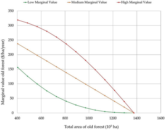 The decision to leave an individual stand as old forest or to harvest is a marginal one, having only a small effect on overall timber or old forest production. As a result, that decision entails computing the net marginal benefits (marginal benefits minus marginal costs) of leaving a stand as old forest. The net marginal benefits can be thought of the marginal benefits of recreational opportunities, wildlife habitat, or biological diversity, less any direct costs such as recreation upkeep or increased damages from wildfire. Opportunity costs are already explicitly captured when considering harvesting the stand. The exact numeric values and functional forms we used for marginal values were intended only to cover a range of alternatives, and did not reflect our judgment of a ‘true’ social marginal value curve. All the marginal value functions were assumed to be for the aggregated value of the total old forest and were assumed to be the same for each planning period. Values were in terms of forest condition at the end of each planning period, and were expressed here in annual terms, representing a value that can be added (or credited) as a series of benefits over time for valuing specific stand-level management options. These marginal values varied by periods, since the total area of old forest changes over time.