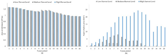 Amount of old forest produced under three aspen harvest levels and the high marginal value function for old forest (showed in Figure 2) (a) and aspen shadow prices for the three aspen harvest levels and the high marginal value function for old forest (b).