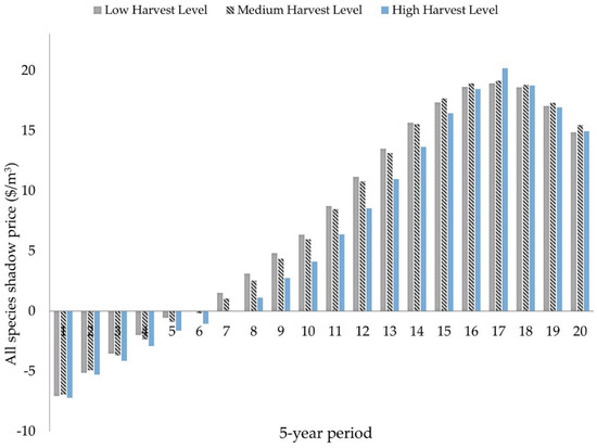 Shadow prices estimates for the all species volume constraints across all three aspen harvest levels (low, medium, and high).