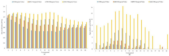 As expected, a higher value assigned to old forest generally led to a larger area of old forest being produced across the planning horizon. The difference between the amounts of old forest produced by marginal value functions becomes larger during the middle periods and decreases considerably at the beginning and the end of the horizon planning (Figure 7a). For example, the ratio of the two extreme marginal value functions—no value and the $148.3/ha scenarios—is more than two during periods 8 to 13, but there is little difference between the two extreme scenarios at both the beginning and the end of the planning horizon.